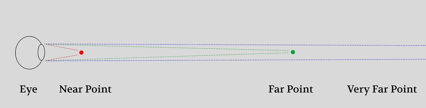 Far points of light diverge at a gentler angle and your eyes need less refractive power to focus them onto the retina.